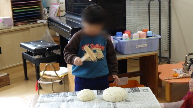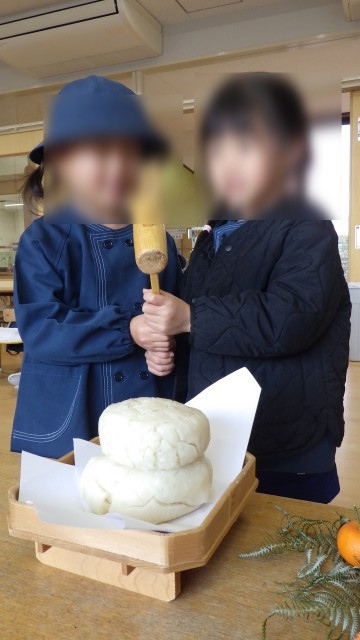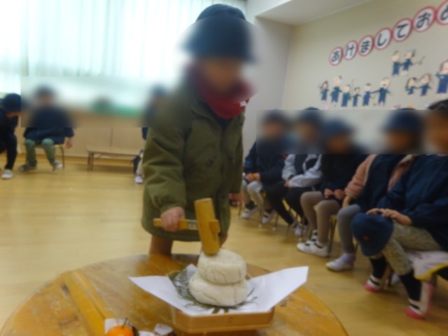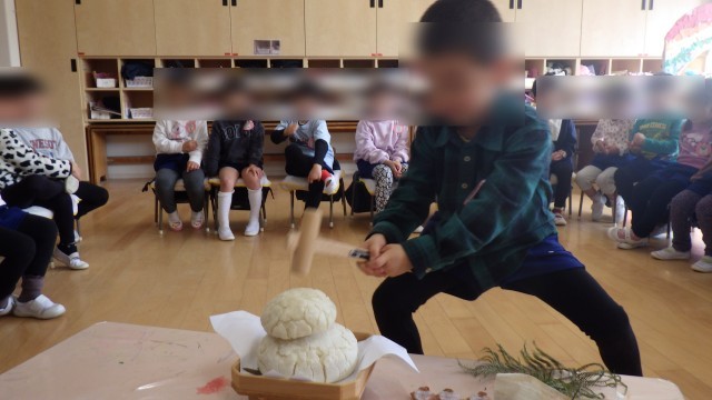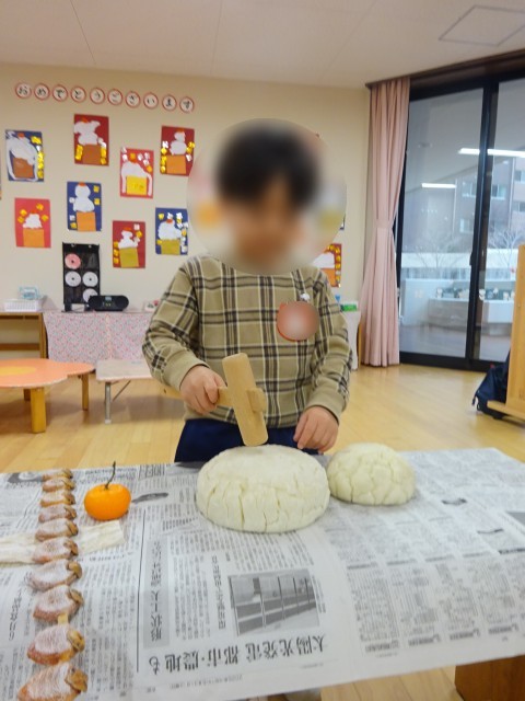 週明け、もちつきでつくった幼稚園用の鏡もちを、みんなで割りました。