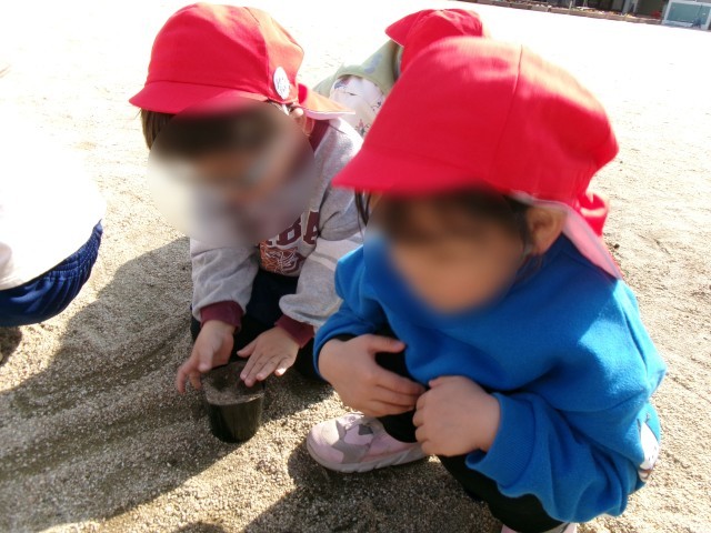 園庭でたくさん遊んだ後、いちご組だけでソラマメの種を植えました。