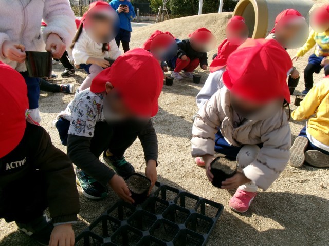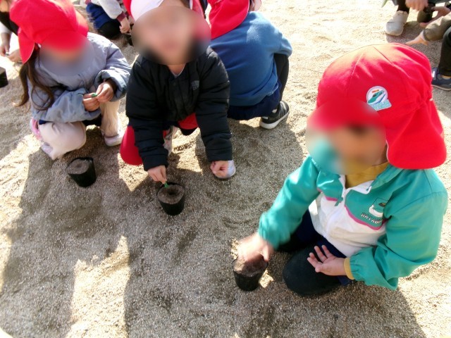 土が入っているポットのおうちに穴をあけ、種を置いて優しく土の布団をかけていました。