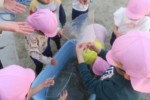 「すごい!!こんなに大きいよ」「水が凍ったんだね」「どうやって氷ってできるのかな?」
