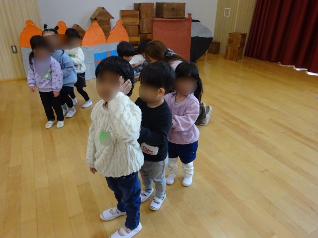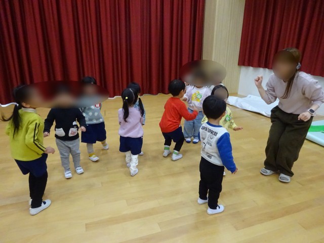ダンスや仲良し遊びをしましたよ。最初は少しドキドキしている様子もありましたが、仲良し遊びをするときには「一緒にしよう!」と手を引く姿や、『こすれこすれ』の音楽に合わせて体をこすり合いっこして楽しむ姿が見られました。