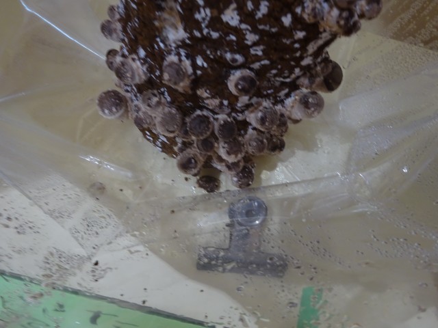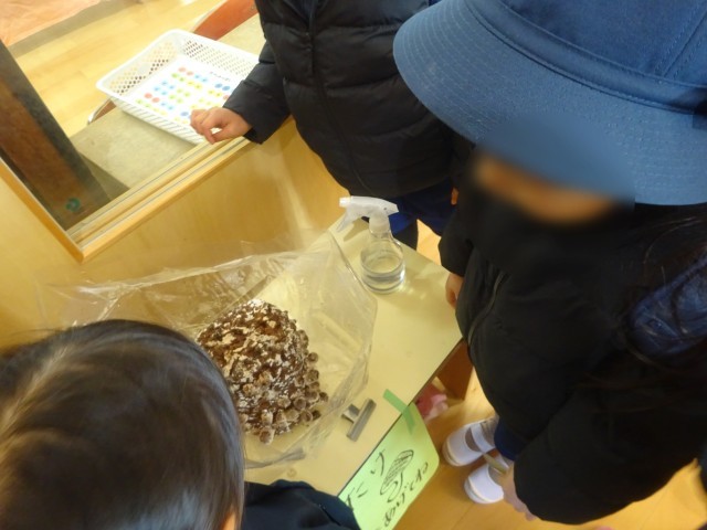 幼稚園でシイタケを育てています。少しずつ小さなキノコが生えてきて子どもたちも驚いていました。