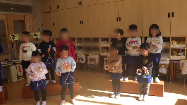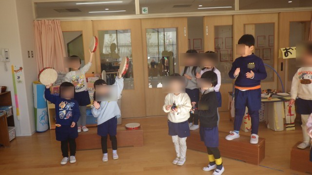 保育室にひな壇を並べて、歌を歌ったり楽器遊びをしたりすると、いつもよりも張り切った表情が見られました。