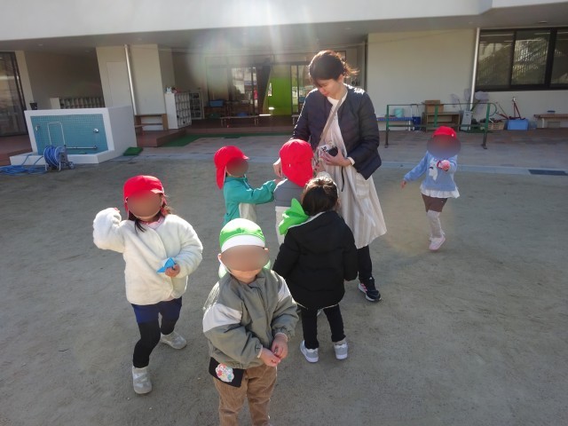 いちご組(3歳児)さんとすくすくランド(未就園児)のお友達は先生が鬼になって、「鬼はそと~、福はうち~」と元気よく豆まきを楽しみました。