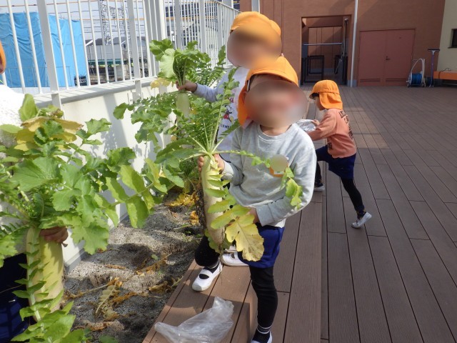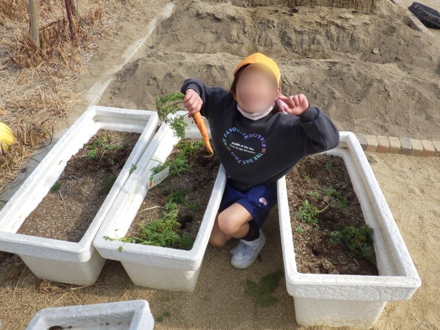 収穫した野菜 おいしかったよ(5歳児) 公開日 2026/02/09 更新日 2026/02/09 お知らせ 先週末に、大根と人参の収穫をしました。自分で好きなほうを選んで、持って帰りました。今日、子どもたちが「先生、炊いて食べたよ。美味しかったよ」「みてみて、弁当に入ってるねん」「焼いて食べてん。塩かけた」などなど、どのように調理して食べたかを具体的に教えてくれました。自分たちで育てたお野菜は、おいしかったですね!どんどん、好きな野菜が増えていきますね。 いいね(2)