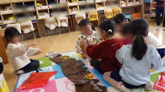 どんな模様だったかな(ほし組) 公開日 2026/02/09 更新日 2026/02/09 お知らせ いよいよ生活発表会本番が近付いてきました。劇遊びで使う大道具や背景ももちろん子どもたちと一緒につくったものですが、当日着る衣装にも子どもたちが模様をつけました。「ヘビってどんな模様やったっけ」「絵本見てみよう」「トンビにはこの色が良いね」と、友達と話をしながらつくる姿が見られました。当日、お家の人に見てもらうのが楽しみですね♪ いいね(1)