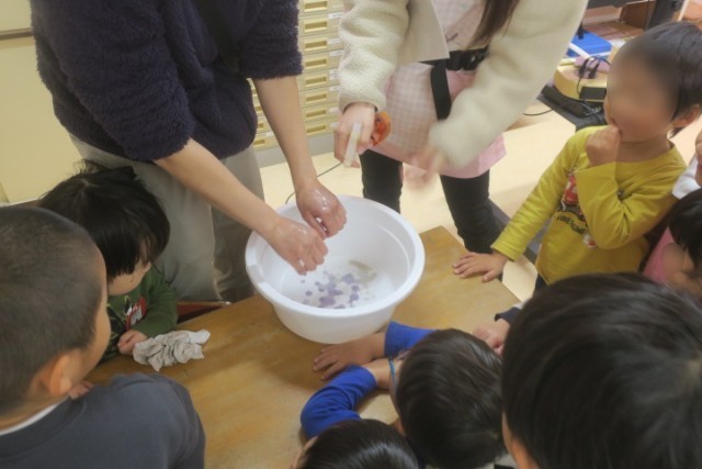 実験では、事前に担任の手にでんぷんのりを塗っておき、洗い残ったでんぷんに