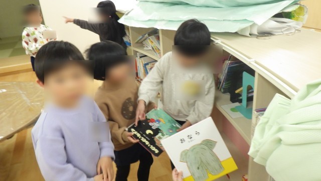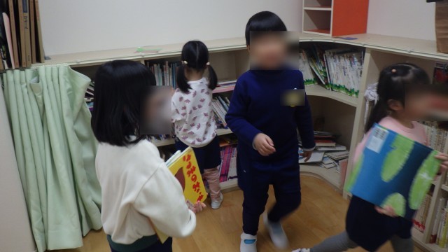 今日は借りていた絵本を返し、そのあと絵本棚に入っている絵本をきれいに片付けました。