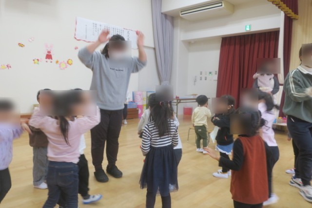 たくさん遊んだ後には、少しの間お家の人と離れて、先生と一緒に体操をしたり、絵本を見たりしました。