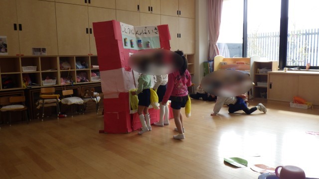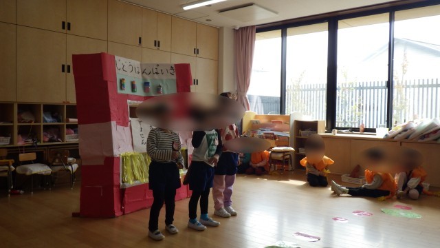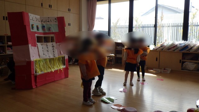 ゆき組として過ごす日が残りわずかとなり、みんなでしたい遊びを話し合いました。すると、「ぽんたしたい!」という声が多く、みんなで生活発表会の際に遊んだ「ぽんたのじどうはんばいき」をすることになりました。