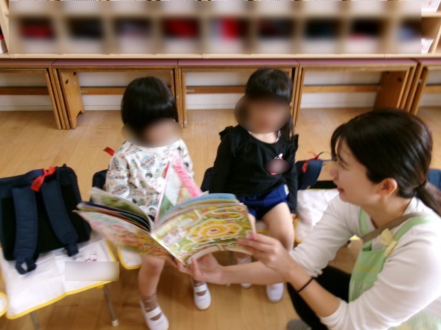 3歳児の保育室では、保護者の方と離れて初めて過ごすお友達も多く、しばらくは泣いている姿もありましたが、先生に絵本を読んでもらったり、一緒に電車や車で遊んだりするうちに少しずつ気分も変わっていったようでした。