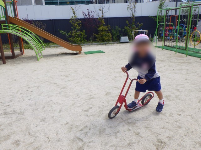 大好きなお外遊びでは、大きい組さんと虫探しや鬼ごっこをしたり、スクーターに夢中になったり、砂場では友達や先生にごちそうをつくって遊んだりしました。
