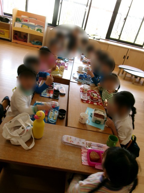 今日から新入園児の子どもたちもお弁当が始まりました。いっぱい遊んだ後のお弁当で、もりもり嬉しそうに食べていました。