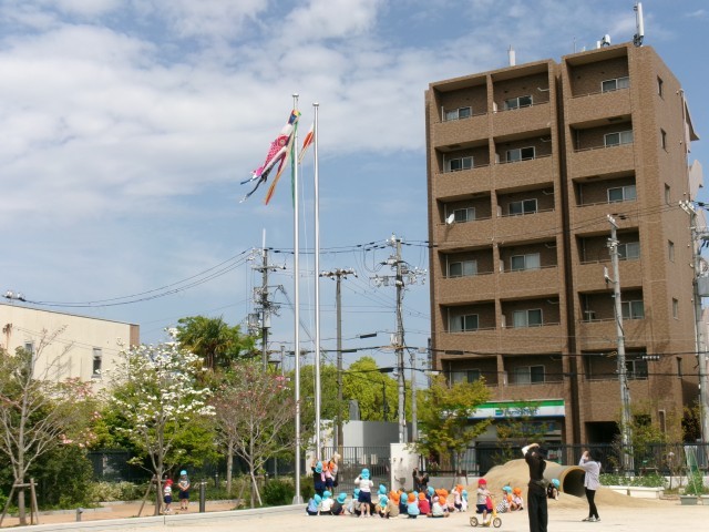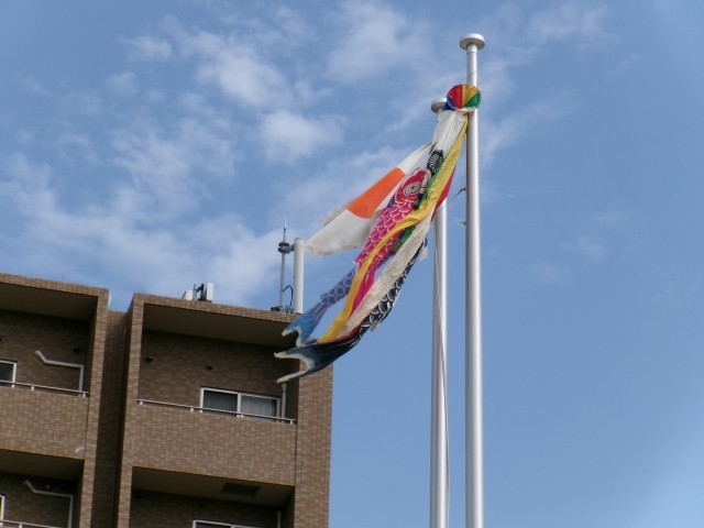今日はとてもお天気がよかったので、こいのぼりも気持ちよさそうに幼稚園のお空を泳いでいましたよ。
