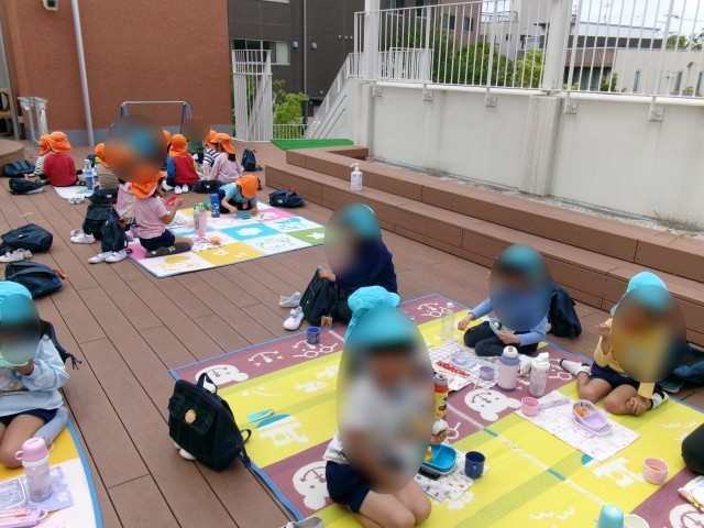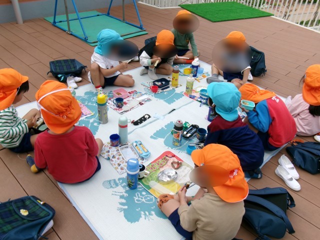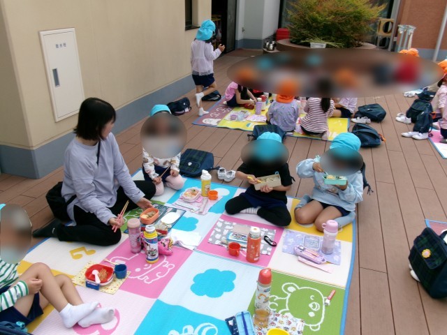 「僕たちがあげたこいのぼりが泳いでる~」「一回転してたよ」と、自分たちのあげたこいのぼりを眺めながら楽しそうに美味しくお弁当をいただいていました。