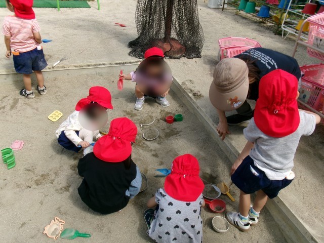 先生を介してですが、同じ場で遊びを楽しむ様子も見られています。また、遊具で体を動かしたり、自分のイメージの中で砂遊びを楽しんだりしています。