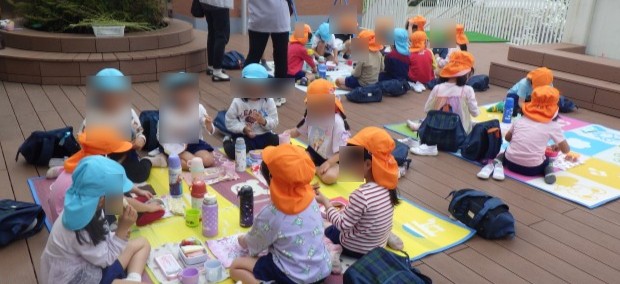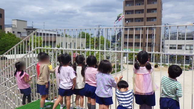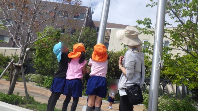 こいのぼりが風に吹かれる様子を見て、「こいのぼりが泳いでる!」「踊ってるみたい」「ここ(ウッドデッキ)からの方が見やすい」「こいのぼりの歌聞こえたかな」と、話していました。