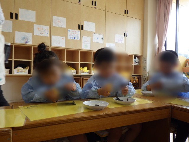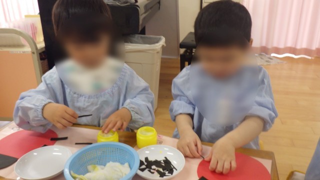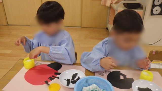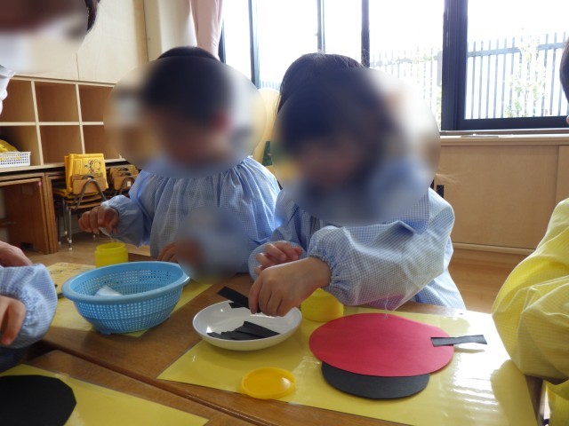 はさみとのりを使って製作をしました。ハサミの持ち方、扱い方、のりの量など一つ一つ丁寧に知らせたり、子どもたちと考えたりしながら製作をしました。