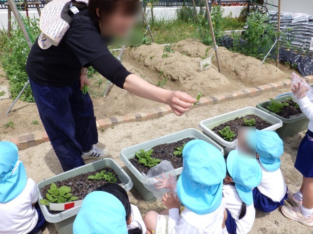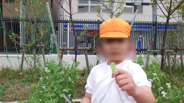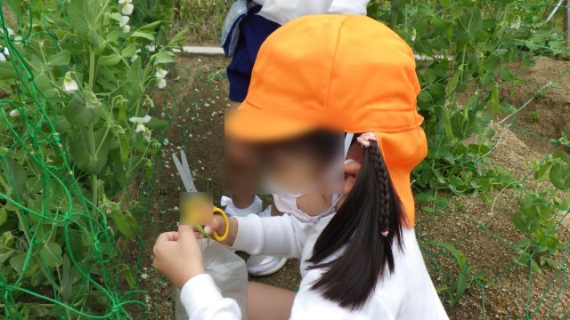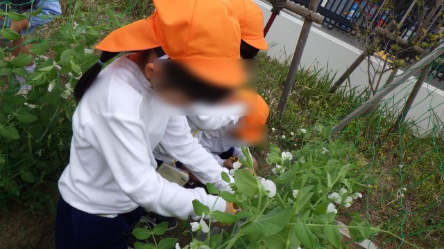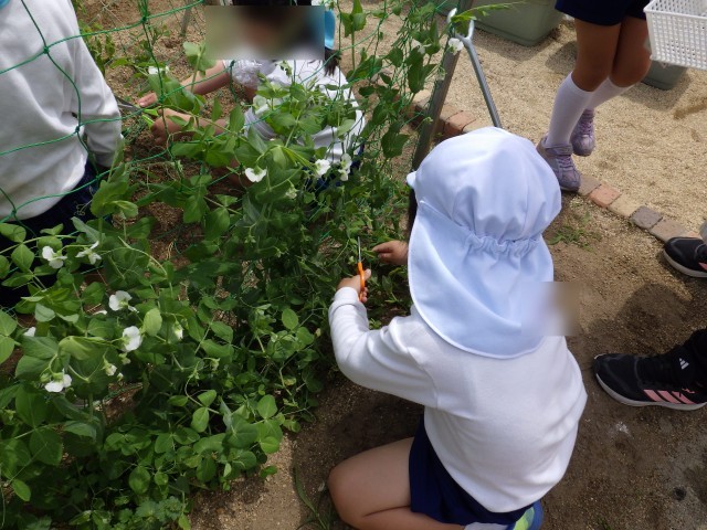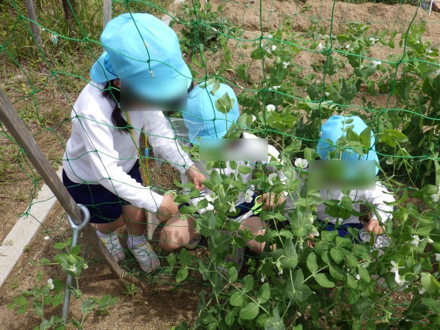 4歳児の時に種を植えたキヌサヤが大きくなり、実をつけたので、みんなで収穫しました!