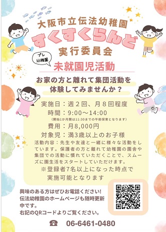 令和7度、3歳児クラスは定員がいっぱいですので、途中入園希望の方はプレ幼稚園のすくすくランドにご参加ください。