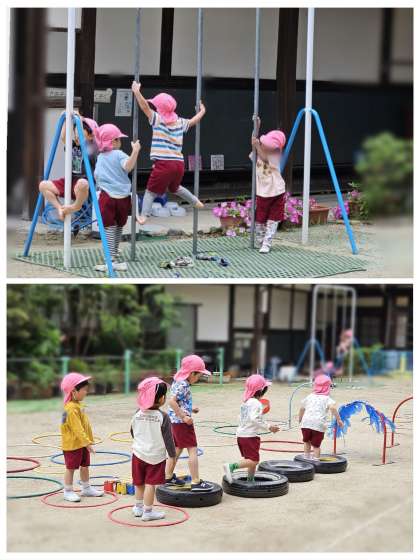 もも組は登り棒に挑戦したり、自分たちで遊具を並べては歩いたりくぐったりと、大好きなダンゴムシになって体を動かして遊んでいました。来週は、しっかり歩いてバラ園へのお散歩デーを楽しみましょう。