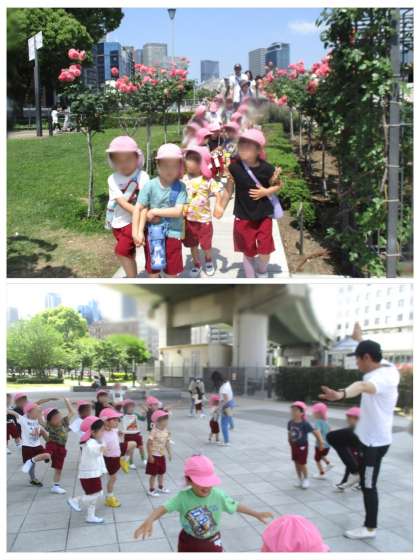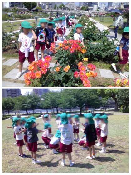 もも組はバラを眺めながら橋を渡り、芝生広場近くで体を動かして遊びました。