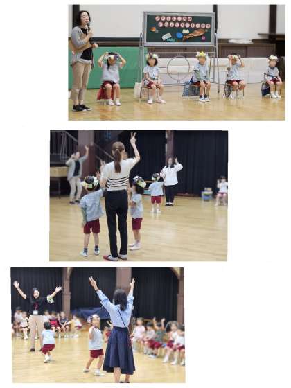 先生たちからのプレゼントは幼稚園にいるお友達、ぴょんちゃん、ちょこちゃん、うみたろうの紹介と「むしむしじゃんけん」でした。全身を使ってジャンケン勝負!誕生児とお家の方、どちらが勝ったのでしょう?!