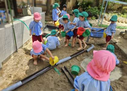 お水遊びしよう!と天気のよい日はみんなで存分に水にふれて遊んでいます。