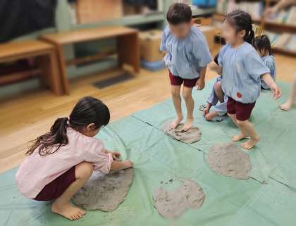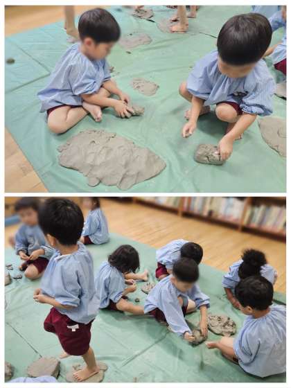 初めて土粘土に関わる4歳児は興味津々です。投げたり足で踏んだり、ジャンプしたりと全身で関わる子どもが沢山いました。丸くなった!形変わった!と両手で丸めたり、もんだり、ちぎったりと形が変わることに気付いて遊ぶ子どももいました。好きな遊び方で楽しんでいます。土粘土は気持ちを発散したり、夢中になったりできる遊びのひとつになっています。