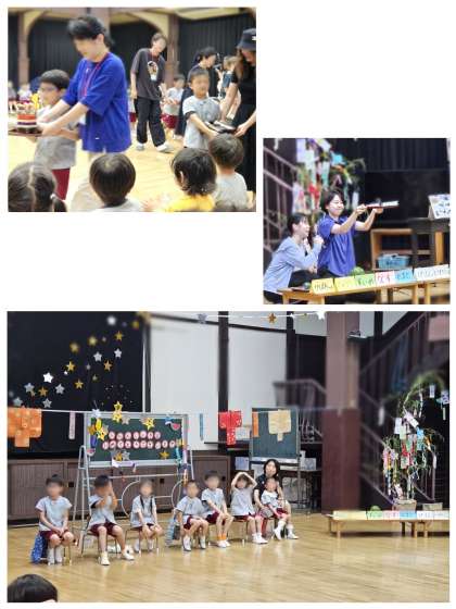 先生からは、七夕のお話を劇にして紹介しました。織姫と彦星は無事天の川で再会することができました。よかったですね。