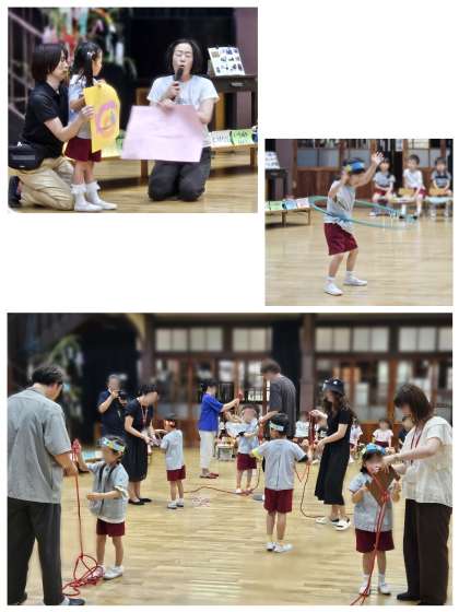 誕生児と保護者の遊びは、織姫のお手伝い、糸巻き競争を楽しみました。糸に見立てた縄を協力して巻いていきました。腕をぐるぐる回して上手く巻けました。今月も楽しく、七夕や夜空への興味や関心を広げた誕生会でした。