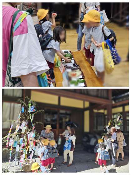 会場には、美しい星がキラキラ輝き、大笹には子どもたちがつくった七夕の飾りや短冊を飾りました。誕生児は、夏野菜や折紙、筆や硯など、この時期ならでは「七夕」のお供え物をみんなに見せてくれました。