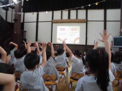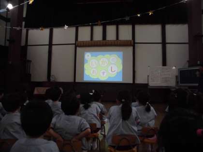 1学期の終業式に引き続き、中央区役所(市民協同課)と東警察署と連携し、防犯指導を行いました。知らない人にはついていかない!と、「いかのおすし」の約束をわかりやすく教えていただきました。○✕クイズにも参加し、合ってると思う方に張り切って手をあげる子どもたち。「今は間違ってもいいよ。今日覚えたらいいからね。」と優しく声をかけていただき、楽しみながら安全な行動や自分の身を守る行動を知ることができました。
