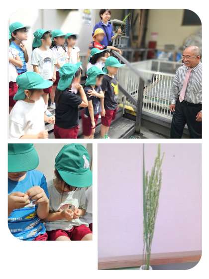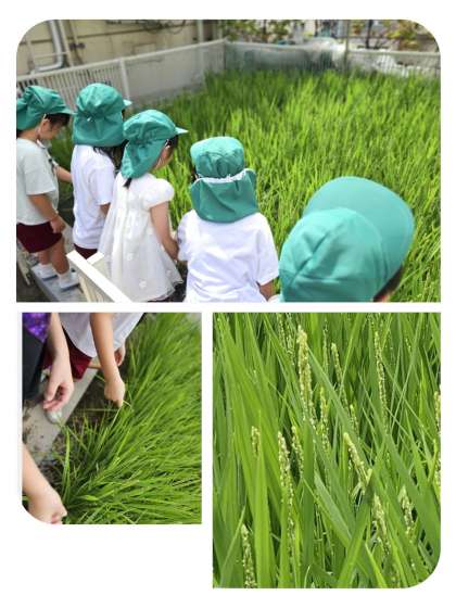 始業式翌日、みどり組は園内散策。みんなで田植えをした稲はぐんと伸びて稲穂をつけていました。「お米できてる!」と発見を楽しんでいました。