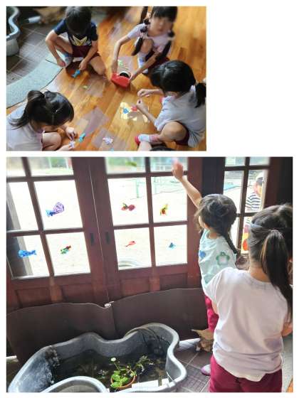 みどり組が友達メダカをつくってくれました。廊下の池のメダカたちも見てくれているかな?!