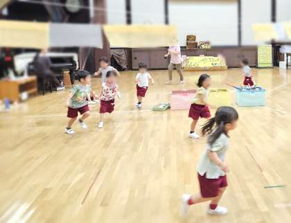 カエルに興味をもっているあか組の子どもたち。先生と一緒にカエルのお世話もしています。カエルになって広い場所でとんだり、散歩したりすることが大好きです。カエルになることをもっと楽しめるようにと、カエルのお面をみんなでつくりました。いろいろな色のカエルのお面ができあがり、早速ジャンプ!そして水槽の前で「こんにちは」とお世話しているカエルに挨拶していた子どもたちでした。