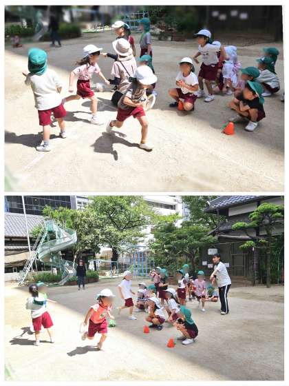 暑い日が続き、園庭で存分に遊ぶ機会はまだ少ないですが、タイミングを見計らいリレーも楽しんでいます。力一杯走る心地よさを味わいながら、勝敗にドキドキ、大歓声!毎回盛りあがっています。