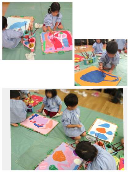 「何色がいいかなぁ!?」と色を選びながら気に入った色の絵の具でかくことを楽しむあか組の子どもたち。筆をしっかりもって画用紙いっぱいに好きなものをかいていました。