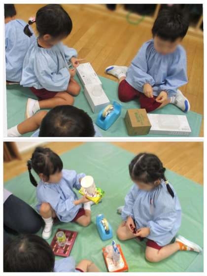 素材をセロハンテープを使って接着にも挑戦です。テープを切ることも初めての子どもか多く、先生に手を添えてもらいながらゆっくり一生懸命に切っていました。「どうやったらくっつくのかな?」と先生がやって見せると「箱と箱あわせていろんなところにくっつける」と自分なりに接着の方法に気付いていました。