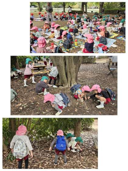いっぱい歩き、見て楽しみ、お腹はペコペコ。昼食は木陰で美味しいおにぎりをいただきました。周辺には小さなドングリが落ちていていて、食べ終わるとドングリを夢中で拾う子どももいました。