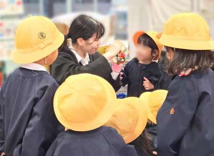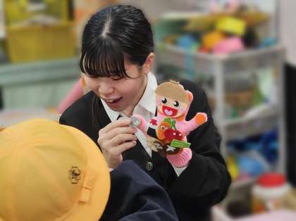 「こんにちは」と指人形が話しかけると「こんにちは!」と元気な声で挨拶していました。美味しいお弁当の話や楽しく遊んでいることを褒めてもらいにこにこ笑顔。「またね」「明日も来てね」とたくさん話しかけていました。