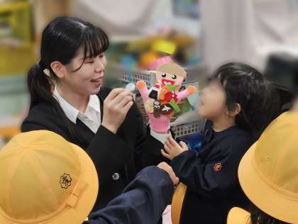 あか組の保育室を覗くと、子どもたちは先生と一緒にかわいい指人形とお話中でした。
