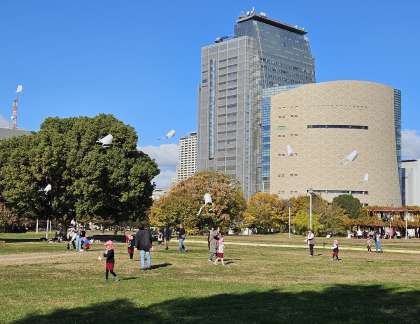 難波の宮跡公園は、広くて力一杯走れることができ、存分にたこあげを楽しむことができました。ビルの間からは大阪城が見えていましたね。