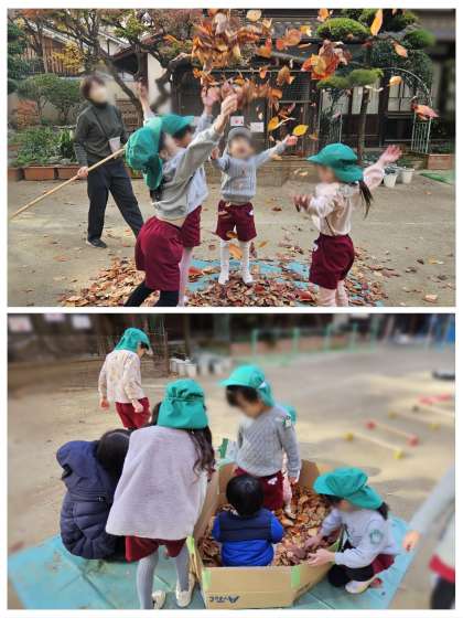 今回のあいあいらんどはみどり組が小さいお友達を遊びに誘ってくれました。落ち葉を集めて、お風呂をつくると興味をもって葉っぱのお風呂に入るお友達がいました。