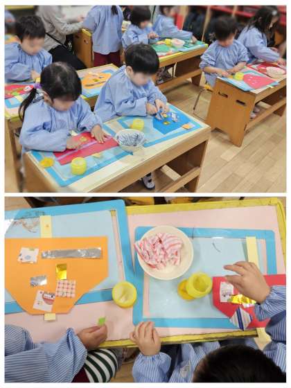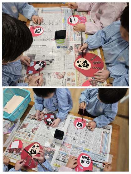 あか組、もも組の子どもたちも楽しみながらコマやだるまをつくっています。