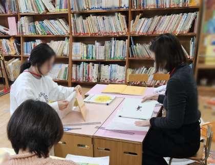 この日、絵本をいつまでも丈夫に保てるようにと、新しく購入した絵本の表紙に透明シートを貼ってくださいました。絵本とシートの間に空気が入らないように、シートを台紙から少しずつゆっくり外して絵本に接着していきます。シートを貼るのはとても難しいですが、皆さんのおかげで絵本は丈夫でピカピカ、汚れもつきません。どんな絵本があるのか、読むのが待ち遠しいですね。絵本係の皆さん、ありがとうございました。