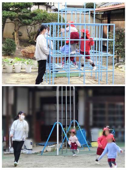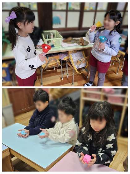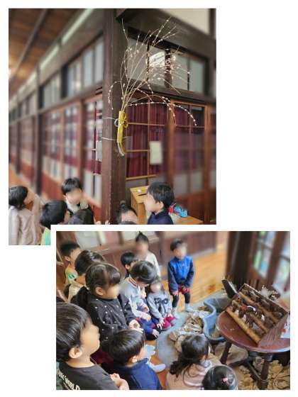 友達と正月飾りを見てまわりました。寒い日が多かったですが園庭では、寒さに負けず元気に体を動かして遊んでいました。室内からはいろいろな楽器の綺麗な音が聴こえてきました。折紙に夢中の子どもたちもいます。