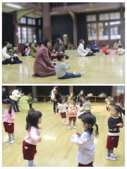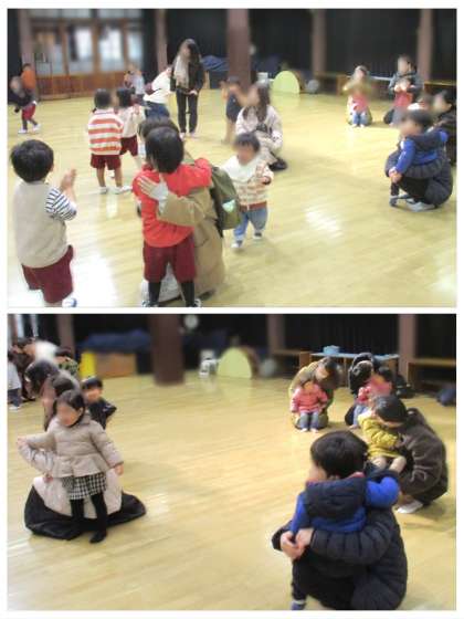 室内では3歳あか組の子どもたちと楽器を鳴らして遊びました。かわいいスズの音が聴こえていましたよ。おうちの方やあか組と一緒に音楽に合わせて体を動かして遊ぶことも楽しみました。「ひっつきもっつき」の曲に合わせてひっついたり、抱きしめてもらったり……ふれあいににっこりでした。