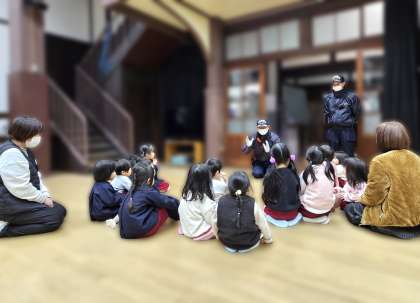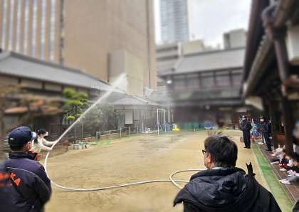 午後からは行政・消防署・地域の方と連携した合同訓練(消防用設備の連動等確認)も実施しました。この訓練は行っており、火災から重要文化財を守る大切な訓練です。打ち合わせを重ね実施しました。預かり保育参加の子どもは火災発生時の約束を守り、煙を吸わないようにハンカチで口を押え玄関先まで避難。安全な行動ができ、消防署の方から褒めてもらいました。教職員は放水確認も行い、緊急時の対応を再確認しました。