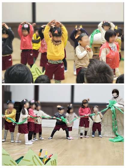 もも組は元気いっぱい体を動かし、登場人物になりきっています。自分たちで必殺技も考えています。